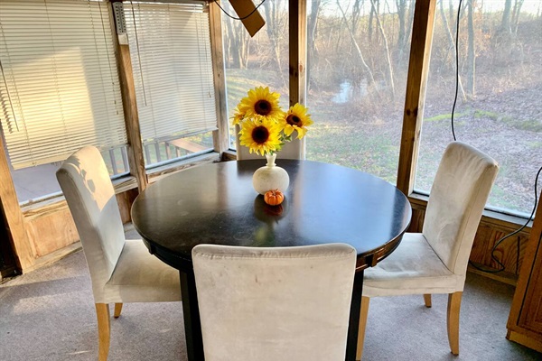 A dining room perfect for setting up a wonderful home cooked meal. Extra seating can be available using chairs from the outside porch area.